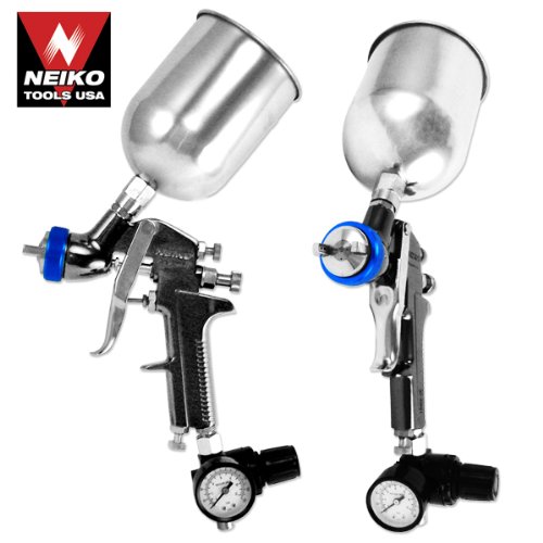 Our Neiko HVLP, High Volume Low Pressure, spray gun has high transfer efficiency, creating an ultra fine mist and a wide spray pattern for maximum control and speed with reduced operating costs. This is a professional caliber air tool that is best suited for medium thick paint like base coat and color. Our HVLP spray gun features: Gravity type feed, Step-less jet width control that adjusts spray pattern. Air regulator with gauge provides smooth consistent air flow. 1.3 mm fluid nozzle for fine thickness paints. Stainless steel nozzle and aluminum alloy body construction. Heavy duty 600 cc aluminum paint cup. The average air consumption is 4.5 CFM. Operation pressure: 40 psi, working pressure: 10 psi. Black nickle finish, color coded nozzle for easy identification. Ergonomically designed pistol grip for maximum control and comfort. Package includes filter, brush, spanner and socket spanner
