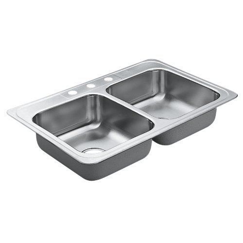 Moen 22826 Excalibur EDE-3322-3, 3 hole Sink, Stainless SteelMoen - Excalibur Series state of the art, new deadening Shield for Moen stainless steel sink is a dense undercoating material applied for exceptional noise reduction.Excalibur Sinks are the ultimate in luxury. Moen Excalibur offers the beauty, dependability and quality of stainless teel plus the special value of Moen Design. Moen 22826 Excalibur EDE-3322-3, 3 hole Sink, Stainless Steel Specifications:;Topmount Double Bowl Sink;Overall Dimension: 33" x 22";3 Hole Application;Equal Size Bowls;Bowl Dimensions: 14" x 16" x 6 1/2";22 gauge, type 301 Nickel-bearing Satinless Steel;5 Year Limited Warranty;U Channel Mounting; See related products for Details;See Undermount Installation Kit if needed for Application;Sink Dimensions are measured left-right x front-back;Please See Additional Information below for Specification and Installaion Manual.